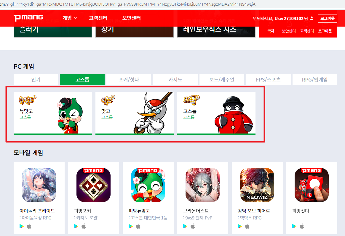 하단을 보시면 PC게임과 모바일게임으로 나뉘어져있습니다.PC게임에 뉴맞고를 클릭하세요