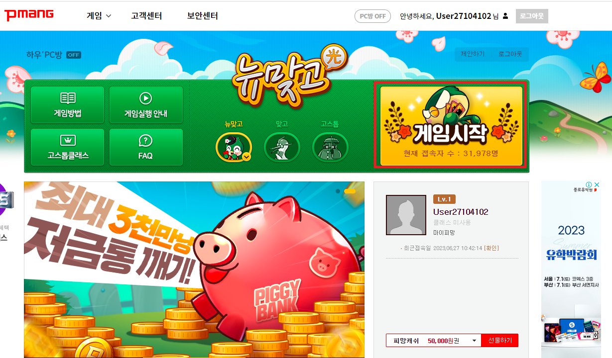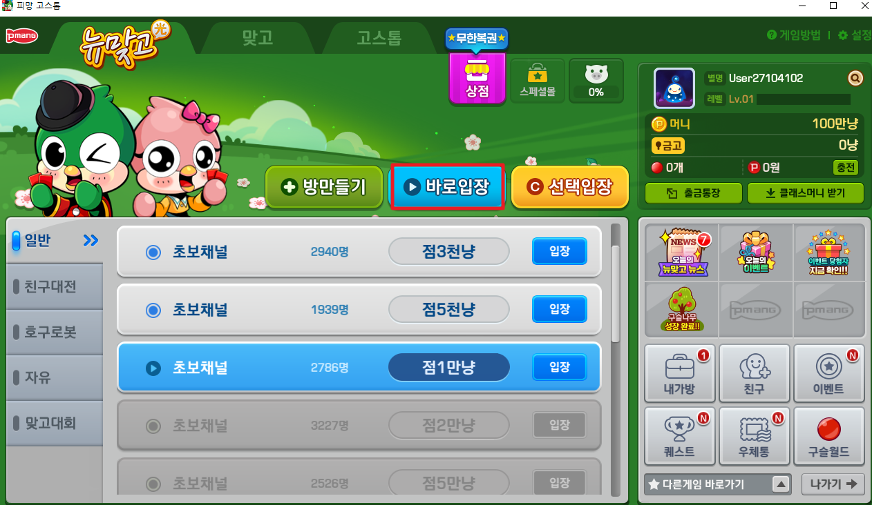 게임설치가 완료되면 피망 뉴맞고가 실행됩니다.이제 바로입장 버튼을 눌러서 게임을 시작하세요