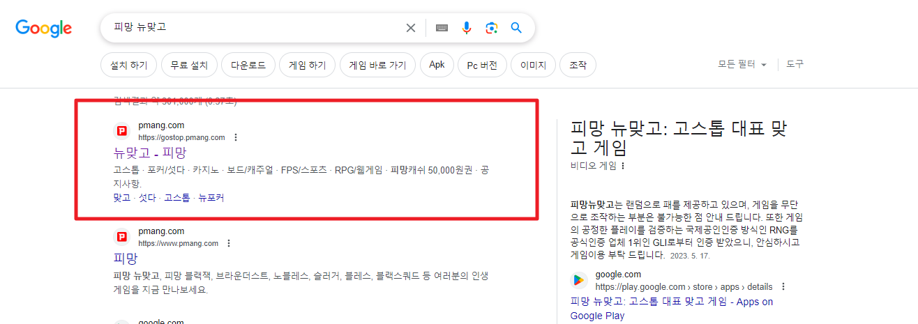참고로 피망 뉴맞고는 사행성으로 분류하는 게임이기 때문에 미성년자는 이용할 수 없습니다. 성인만 로그인이 가능하니 참고하시기 바랍니다.우선 구글검색창에 피망 뉴맞고를 검색해줍니다.